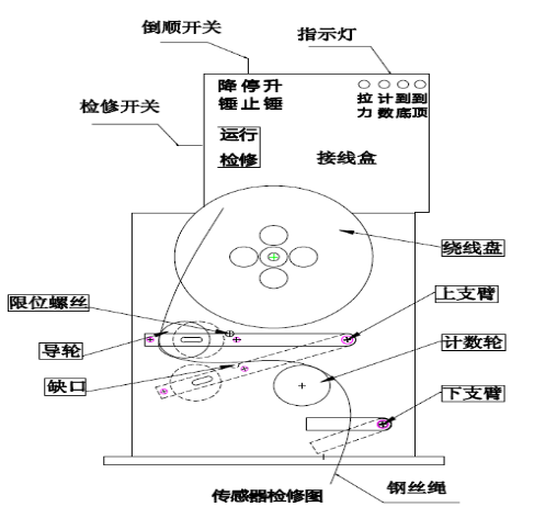**后檢查一下導輪、計數(shù)輪轉(zhuǎn)動是否靈活,上支臂水平時,缺口要和限位螺絲剛好吻合。檢修完畢,將“倒順開關”撥到“升錘”,繞線盤順時針旋轉(zhuǎn),直到重錘上升到頂部,電機會自動斷電,此時將“倒順開關”撥回中間“停”,再將“檢修開關”撥到“運行”,蓋上外殼。